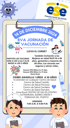 La Empresa Social del Estado Barrancabermeja invita a esta octava jornada de vacunación para que acuda con los niños, también mujeres en edad fertil, mujeres gestante y población mayor de 60 años.