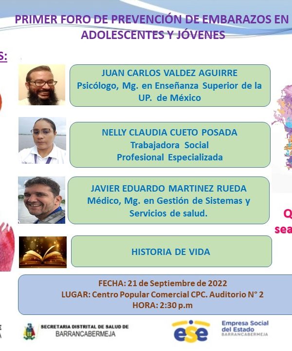 PRIMER FORO DE PREVENCIÓN DE EMBARAZOS EN ADOLESCENTES Y JÓVENESE.S.E. Barrancabermeja16 de septiembre de 2022Te Invitamos a participar a este evento que realizamos con el Plan de ... Leer más