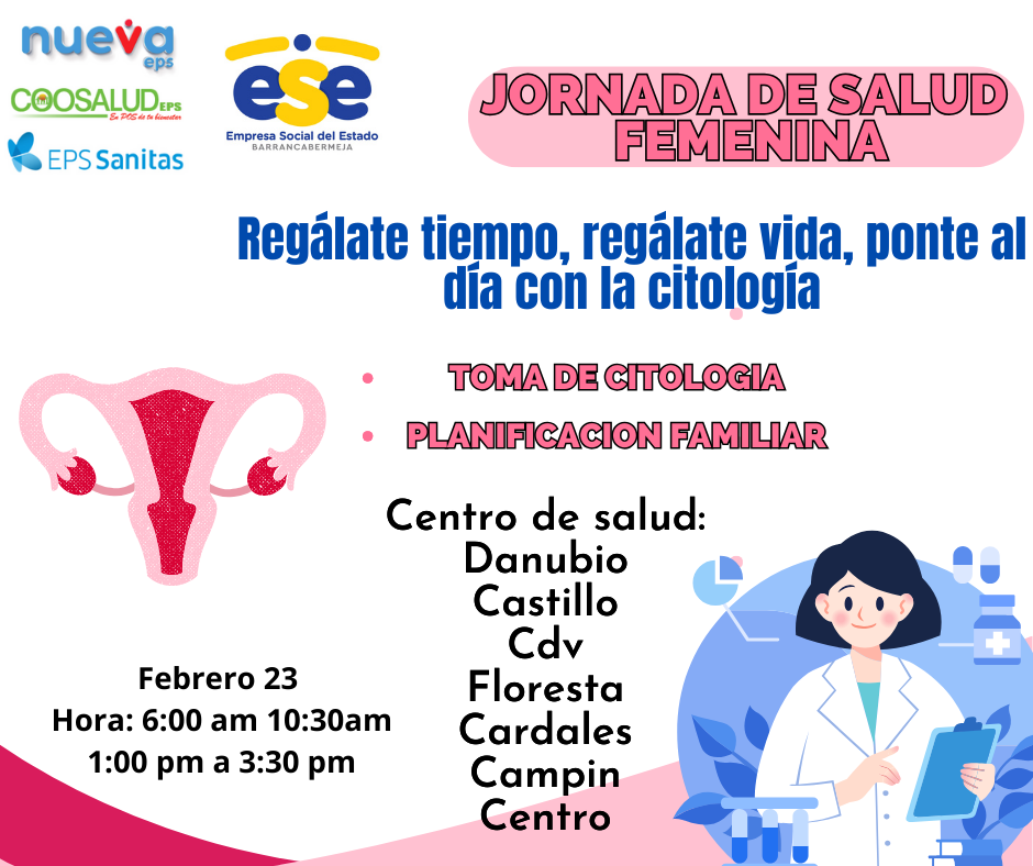 El día Viernes 23 de Febrero de 2024, estaremos en todos nuestros centros de salud, realizando tamización citologías y asesoría de planificación familiar ¡Sin agendamiento previo!.