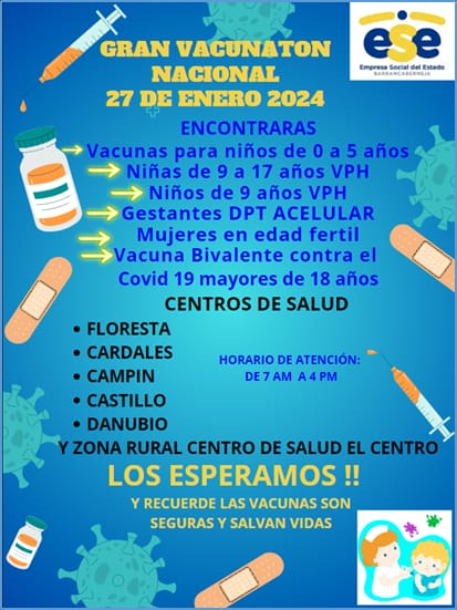 Este sábado 27 de enero DE 2024, los Centro de Salud se sumaron a la primera Jornada Nacional de Vacunación, en la que los Barranqueños se podrán poner al día con los esquemas de vacunación.