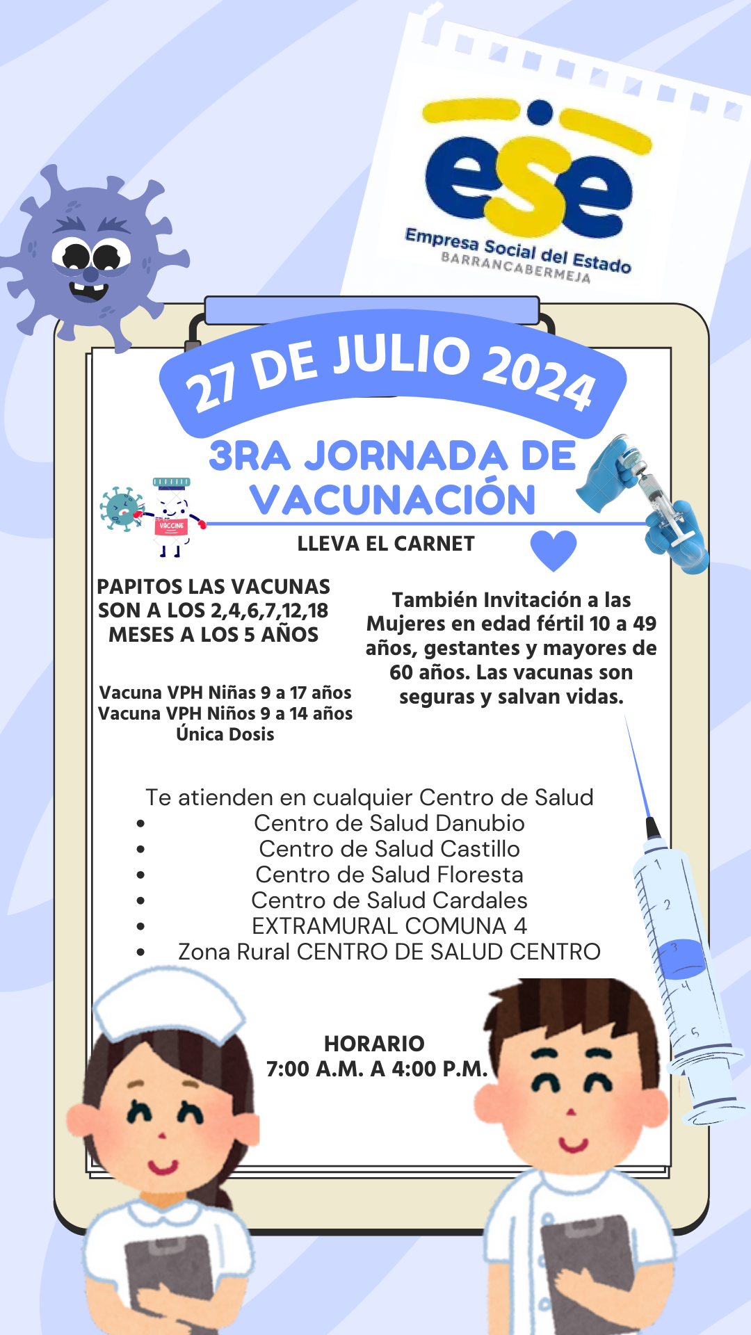 La Empresa Social del Estado Barrancabermeja los invita para que el próximo sábado 27 de julio de 2024 los papitos vacunen a sus niños y jóvenes, también tenemos vacunación para las mujeres en edad fertil y gestantes y personas mayores de 60 años. Recuerda…