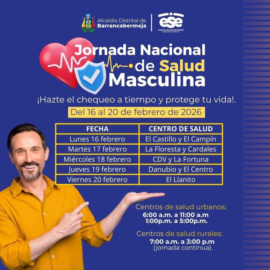 Barrancabermeja, 14 de febrero de 2026. Del 16 al 20 de febrero de 2026 se desarrollará una nueva edición de la Jornada Nacional de Salud Masculina, liderada por la ESE Barrancabermeja en articulación con la Alcaldía Distrital, esta vez con énfasis en la detección temprana del cáncer colorrectal y la prevención de enfermedades de alto impacto en la población masculina.